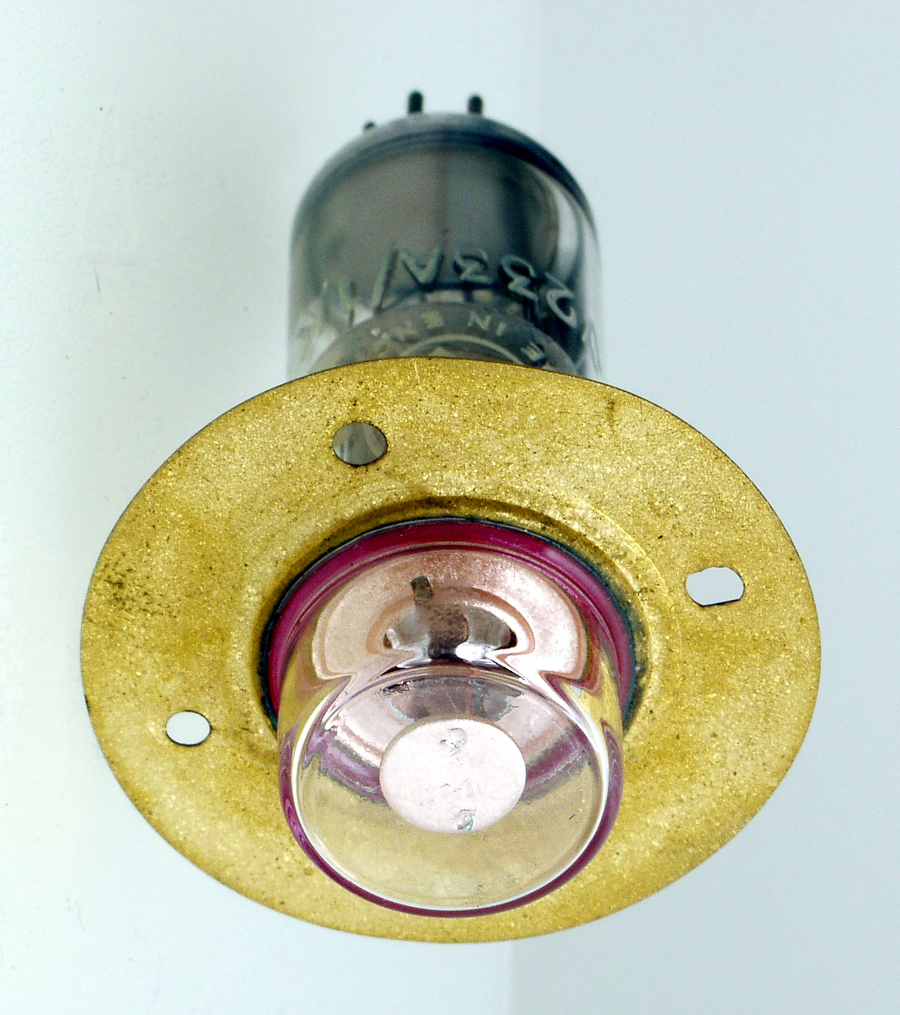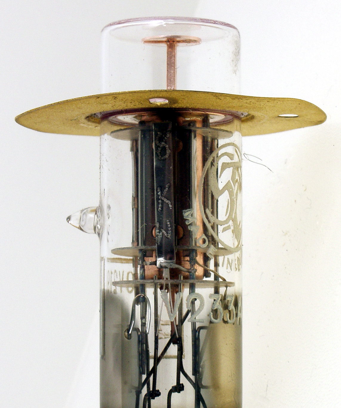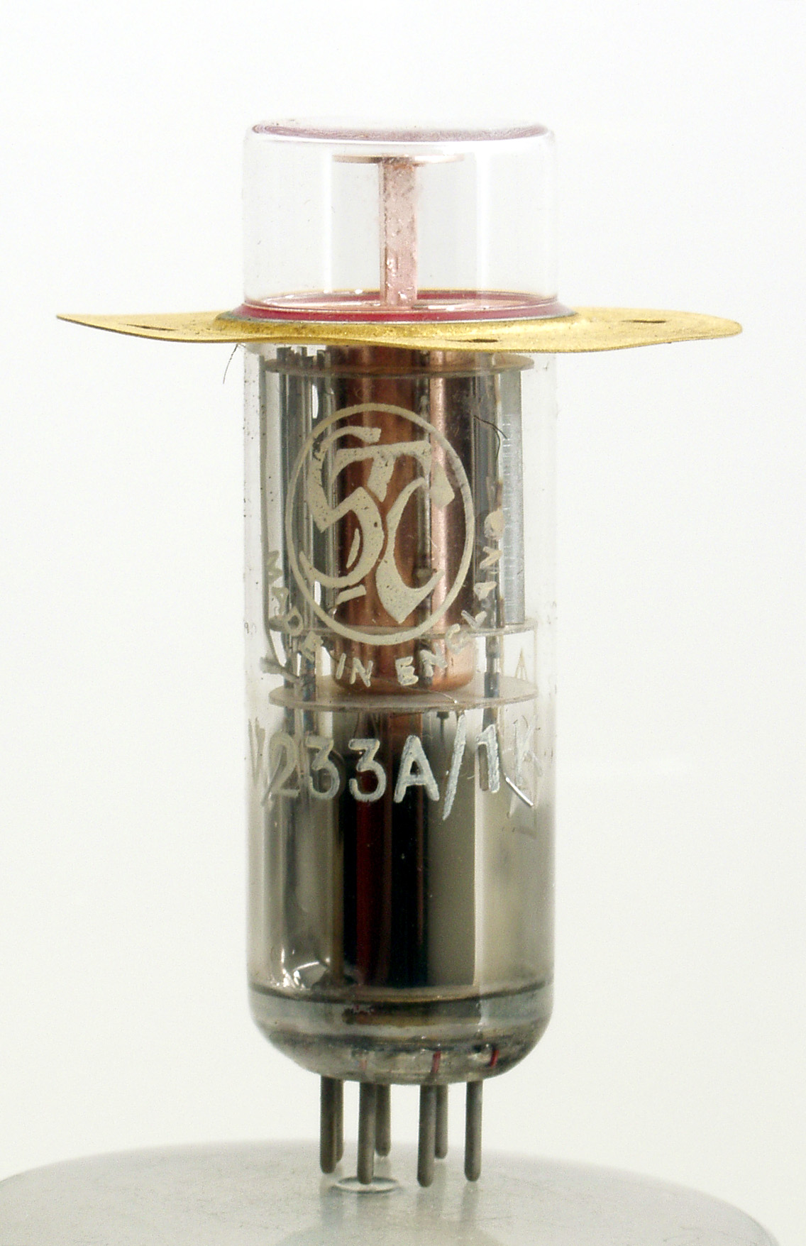 The V233A/1K is a Heil tube microwave oscillator valve. Like the Klystron the Heil tube is a velocity modulated device designed for co-axial line mounting.